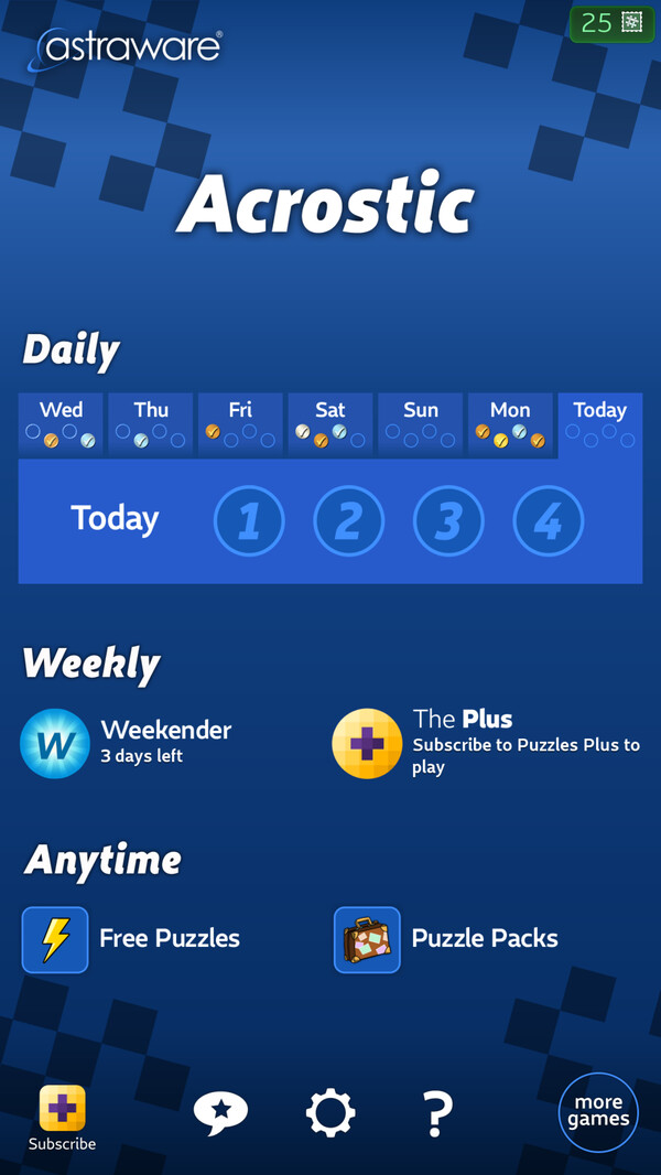 You get free unlimited access to play four new Daily puzzles each day, and compete on the global leaderboard and see your own performance! For an extra challenge there’s a free Weekender puzzle available each week with a larger puzzle and trickier clues. There are 50 built-in free puzzles with a range of difficulties and sizes, so you can play offline at any time.