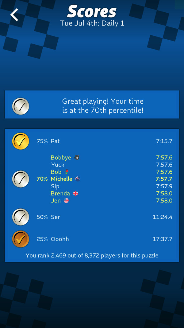 Love the app. I enjoy the 4 puzzles a day and the fact that I can compete against others. Great mental workout to start my day.